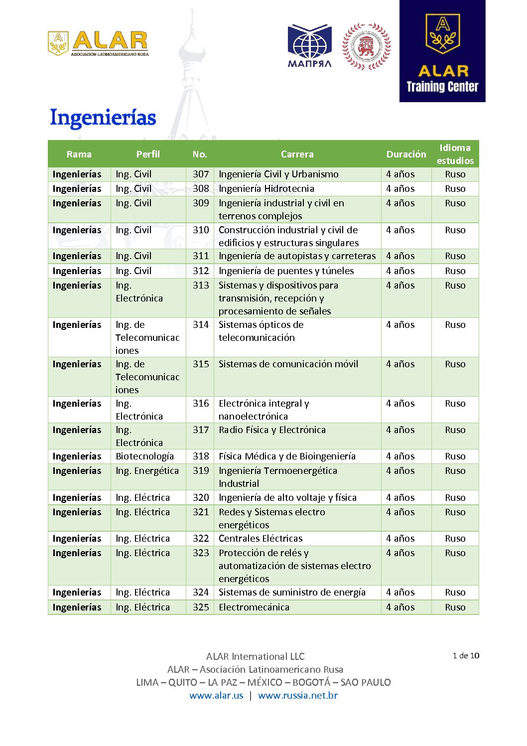 Rusia ofrece carreras en las ramas clásicas de la Ingeniería pero adicionalmente en ramas de vanguardia como: Ing. Aeroespacial, Ing. Aeronáutica, Ing. Genética, Ing. Nanotecnologías, Ing. Robótica y Mecatrónica.